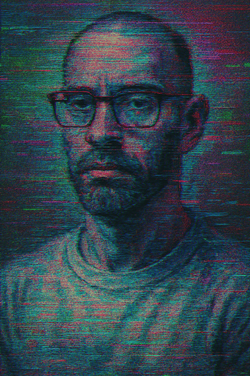 Now we reach the digital age. The image is distorted, torn apart by pixels and color bleed. Glitch Art reveals a face struggling to maintain its coherence, the truth flickering in and out of existence. Somehow, the hours behind a screen also show best, right here. And while I do not like this as a vibe, it is spot on as a reflection of a mood I know all too well, but simply cannot express in equal diginity with my own visage.